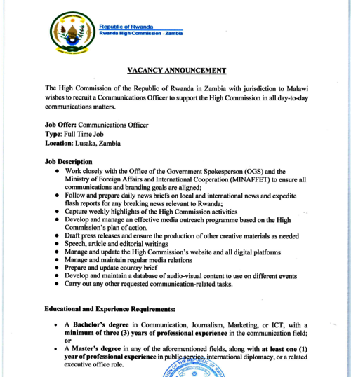 It is my pleasure to welcome you to the official website of the High Commission of Rwanda in Zambia. In addition to Zambia, our High Commission also represents Rwanda in Malawi.