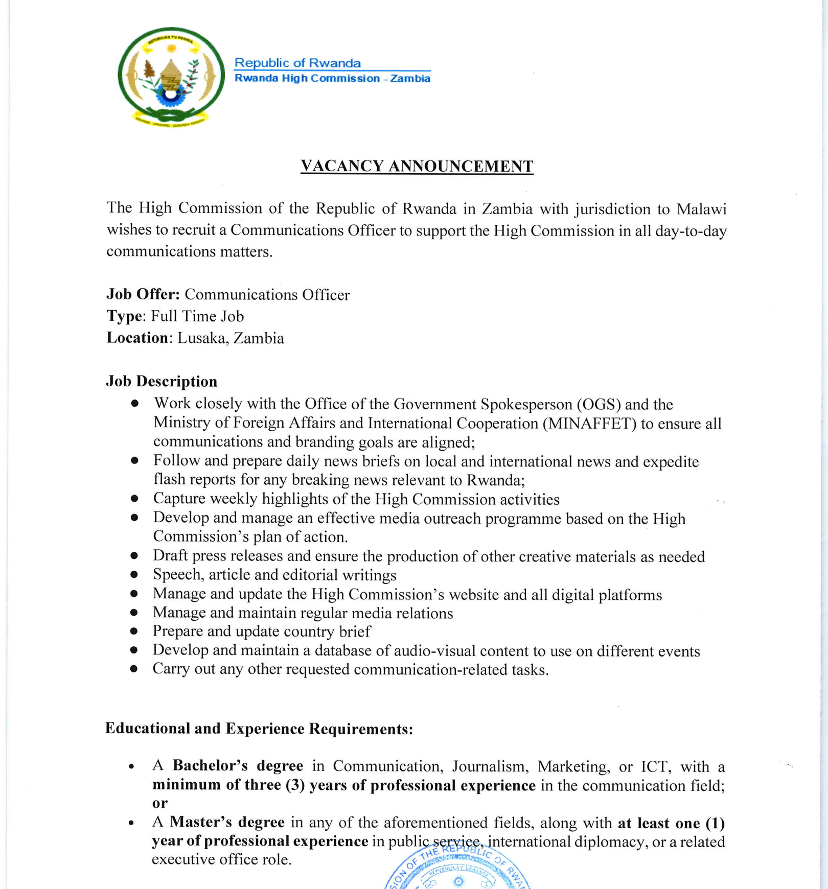 The High Commission of the Republic of Rwanda in Zambia with jurisdiction over to Malawi wishes to recruit a Communications Officer to support the High Commission in all day-to-day communications matters.